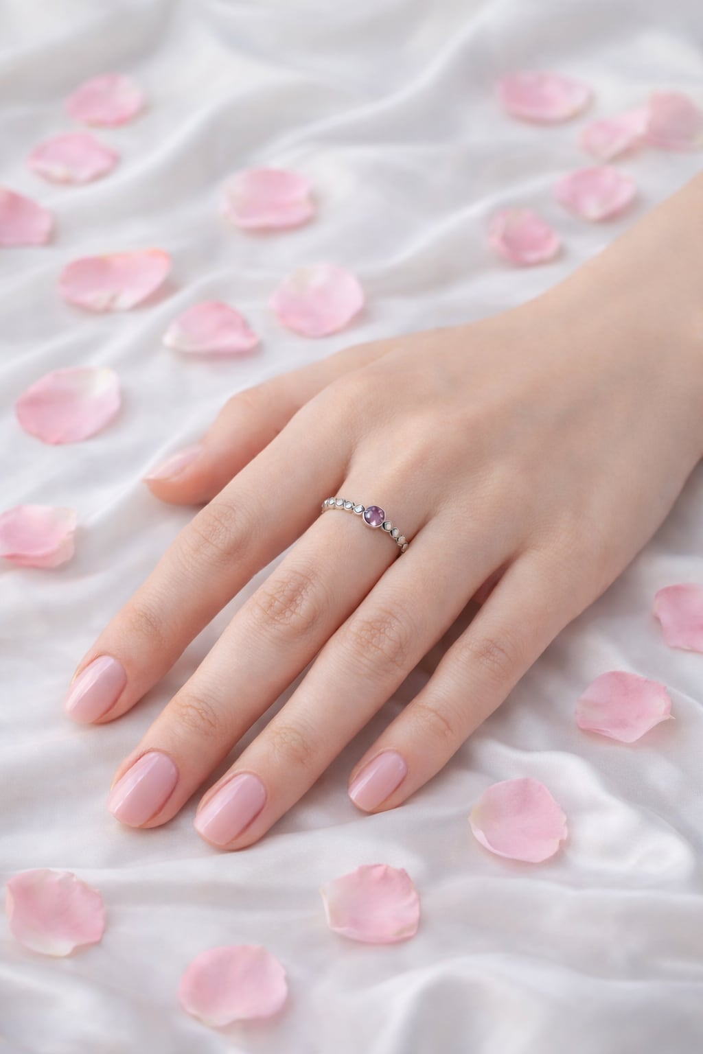 定番商品のエターナル・ドットに、可憐なピンクトルマリンをあしらいました。 ピンクトルマリンは「愛の石」と呼ばれ、職場や友人、家庭内の人間関係を円滑にしてくれる効果があると言われています。 アームはシルバーがひと粒ひと粒きらめく細身のデザイン。重ねづけにもおすすめです。 ◆素材:SILVER925、ピンクトルマリン ◆サイズ:11号 幅(太さ):約2.0mm 厚さ:約1.5mm 重さ:約1.1g ◇金属アレルギーに対応した商品ではありません。お肌に合わない場合は使用を中止してください。 ◇ひとつずつ心を込めて手作業で製作しております。色や形に若干の違いが生じる場合がございます。 ◇繊細なデザインのため、強い力を加えると変形や破損の恐れがあります。お取り扱いはやさしくお願いいたします。