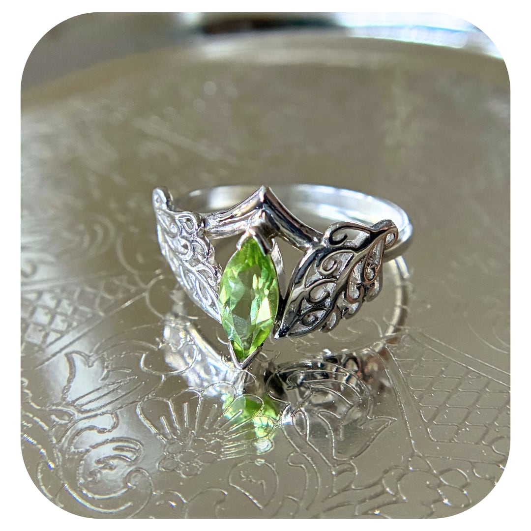 新緑の森を散策しているとき、一瞬目にした美しい光景。風に揺れる葉っぱの間からこぼれ落ちる陽の光が、透明な緑色に輝く姿を思い出し、その情景をデザインに落とし込みました。ペリドットの優しい色合いと、繊細なフォルムが魅力です。