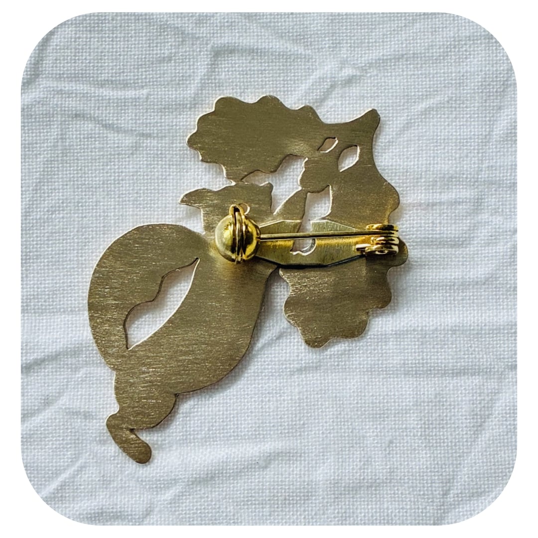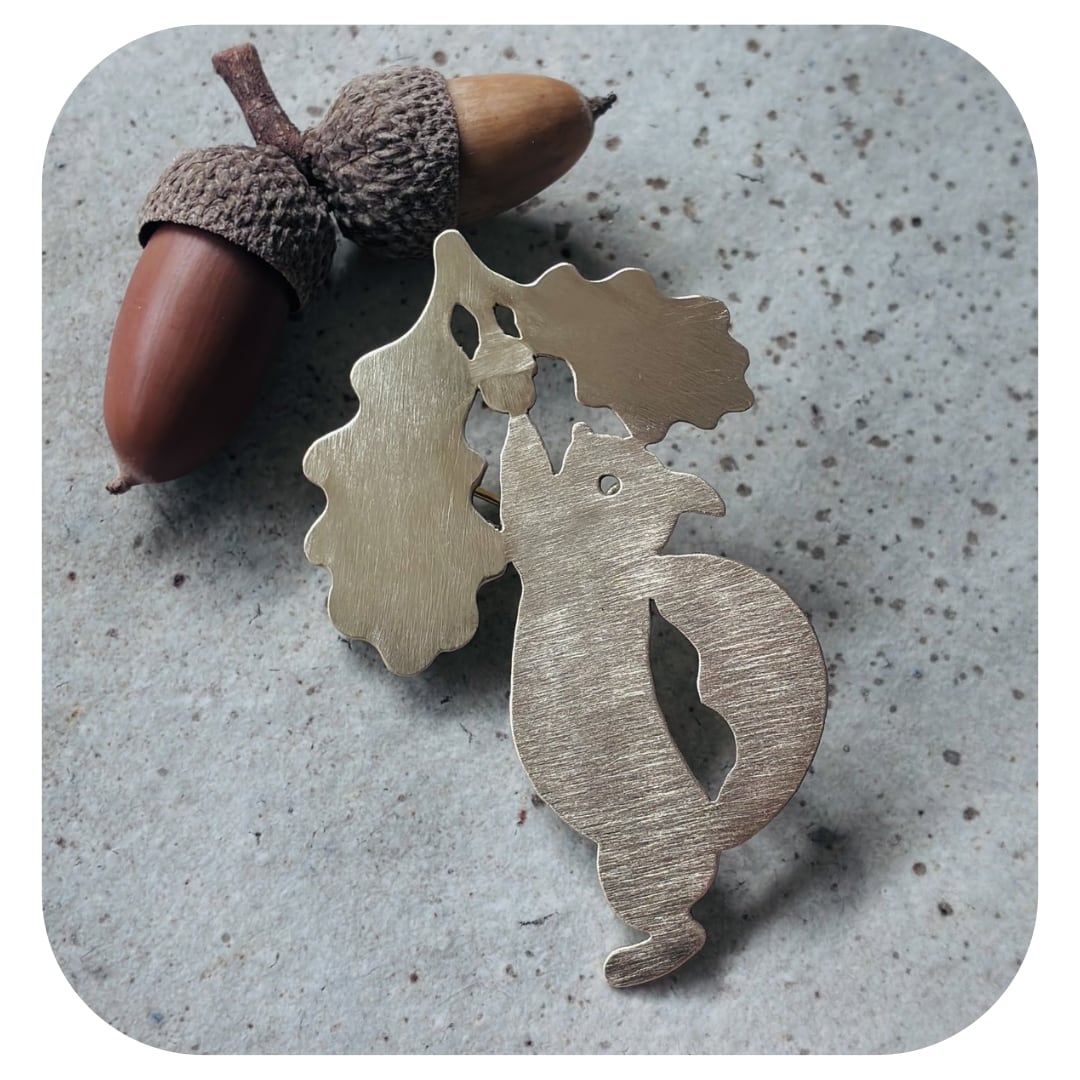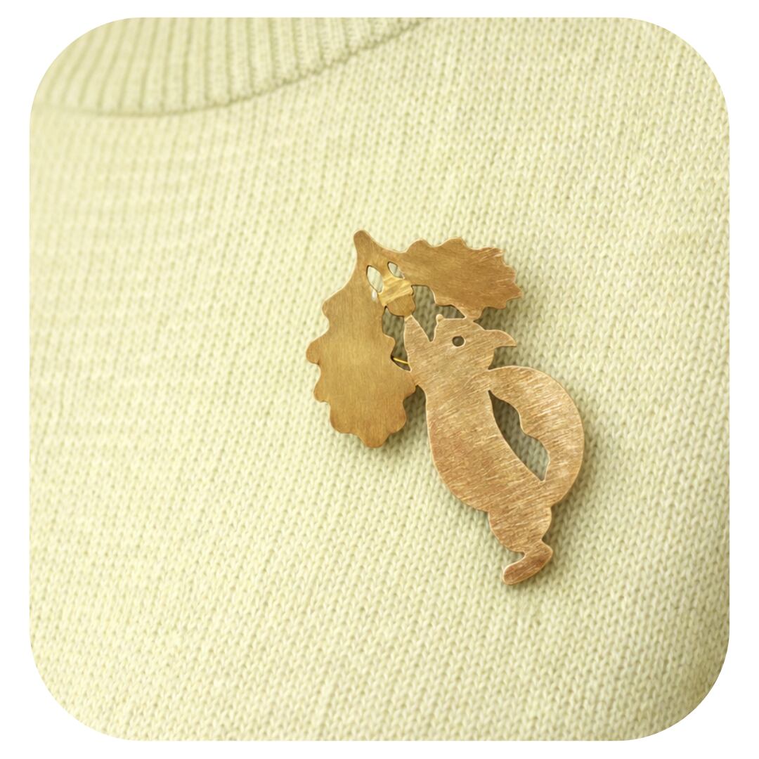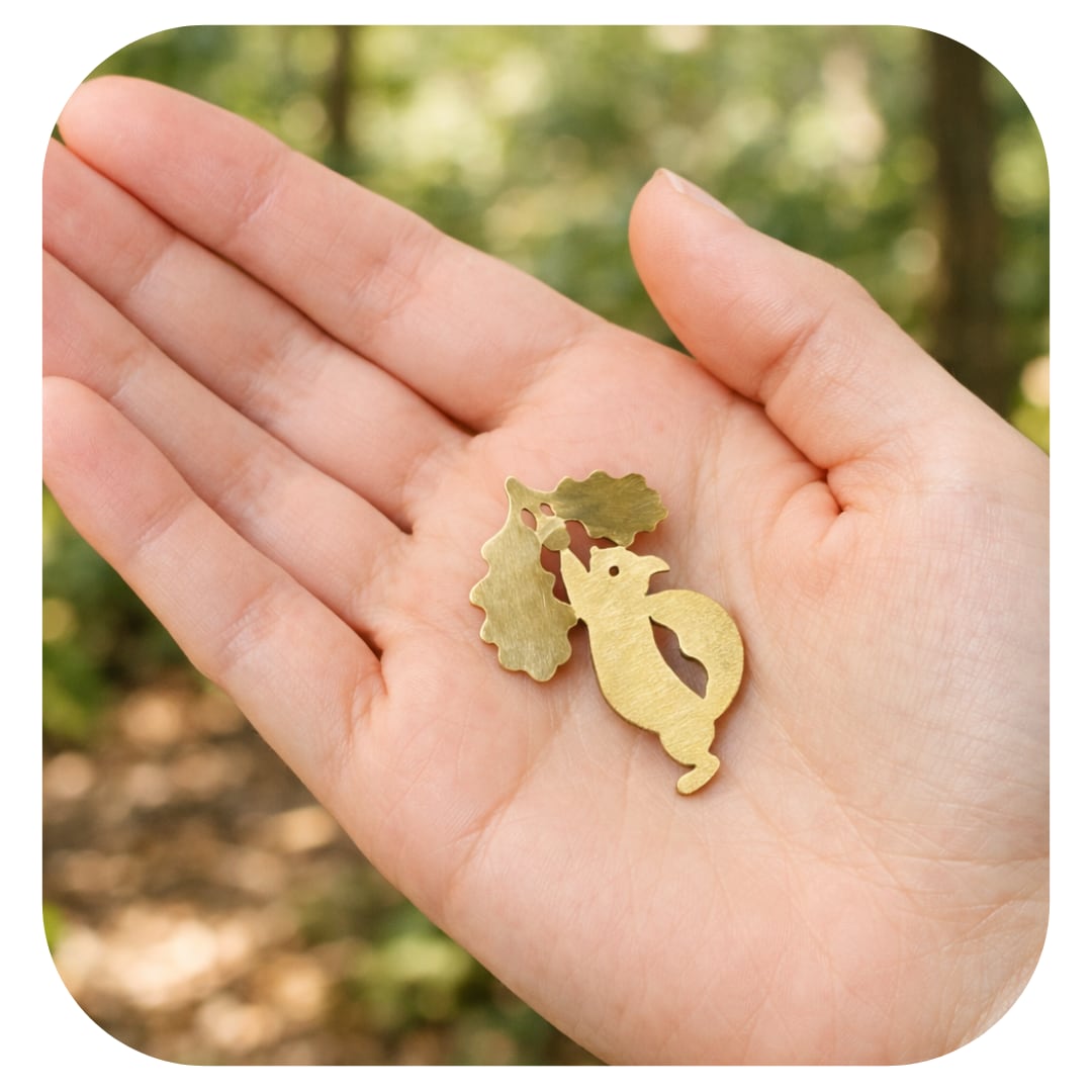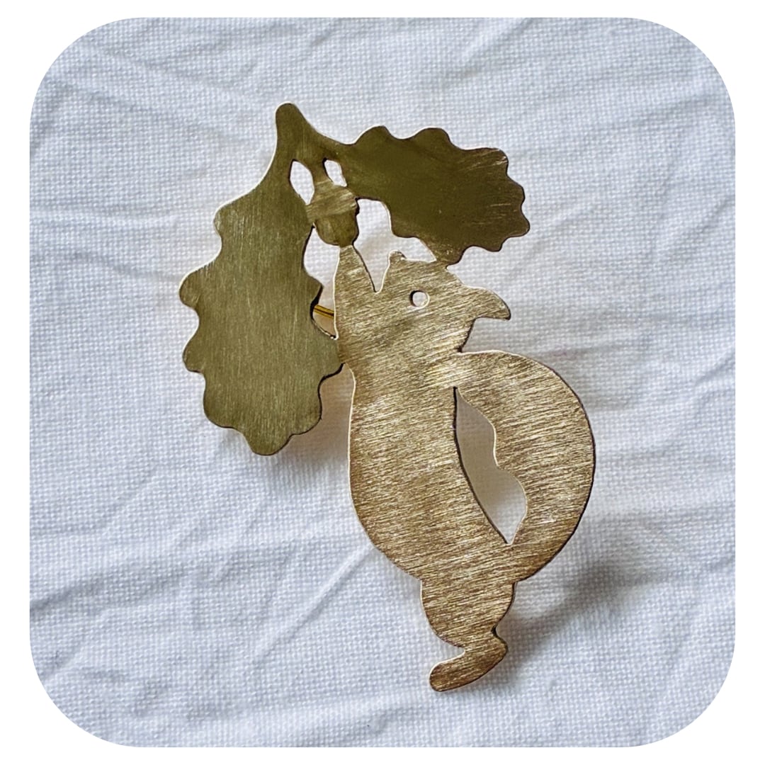 木に実ったどんぐりを取ろうと、背伸びをするニホンリス。その愛らしい姿を、真鍮のブローチにしました。