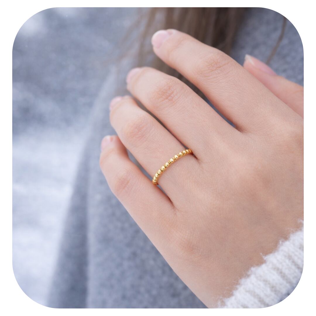 幅(太さ)約1.5mmの華奢なリングですが、ひと粒ひと粒がやさしい金色にきらめき、指先を華やかに彩ります。